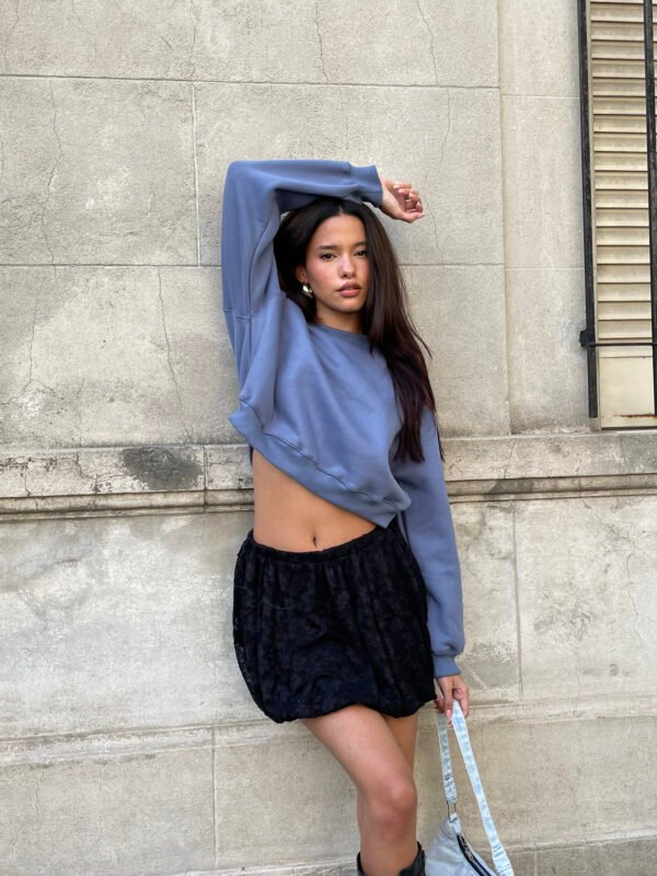 Detalle: Buzo oversize crop con puños y cintura entallada.