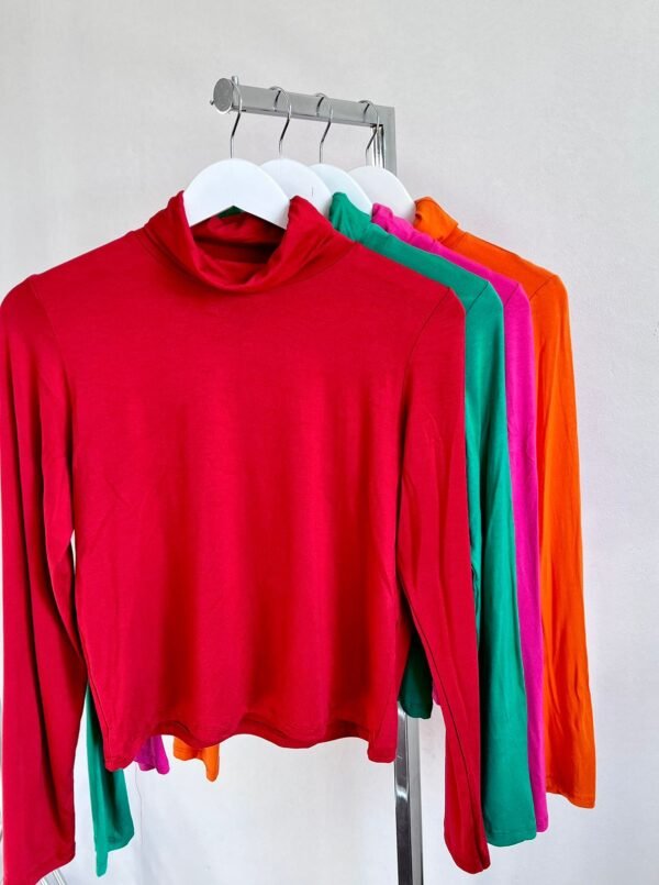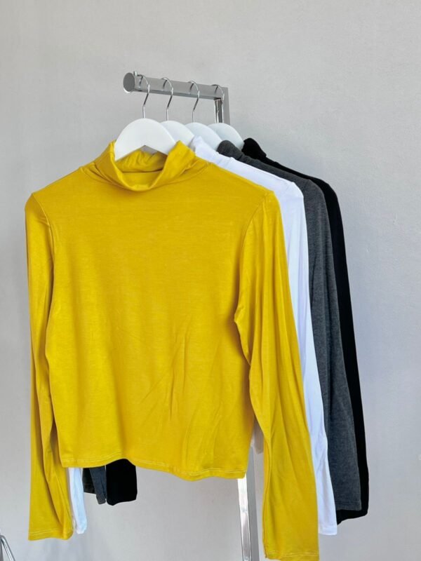 Detalle: Polera clásica cuello alto doble tela y mangas largas.